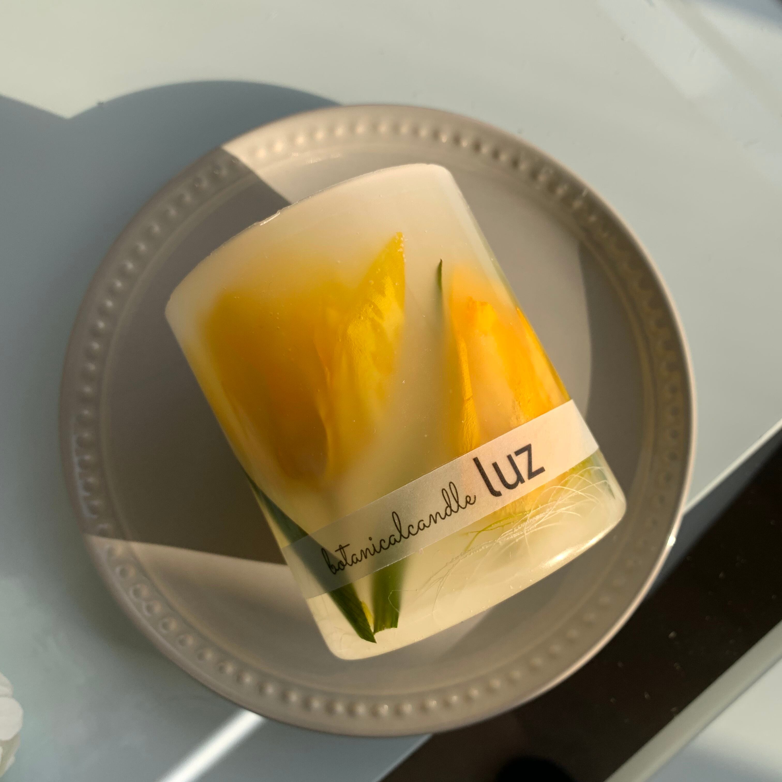 両面楽しめるように、正面にチューリップ、裏面にはスイートピーを入れたキャンドルです。気分で変えてご使用下さい(^-^)